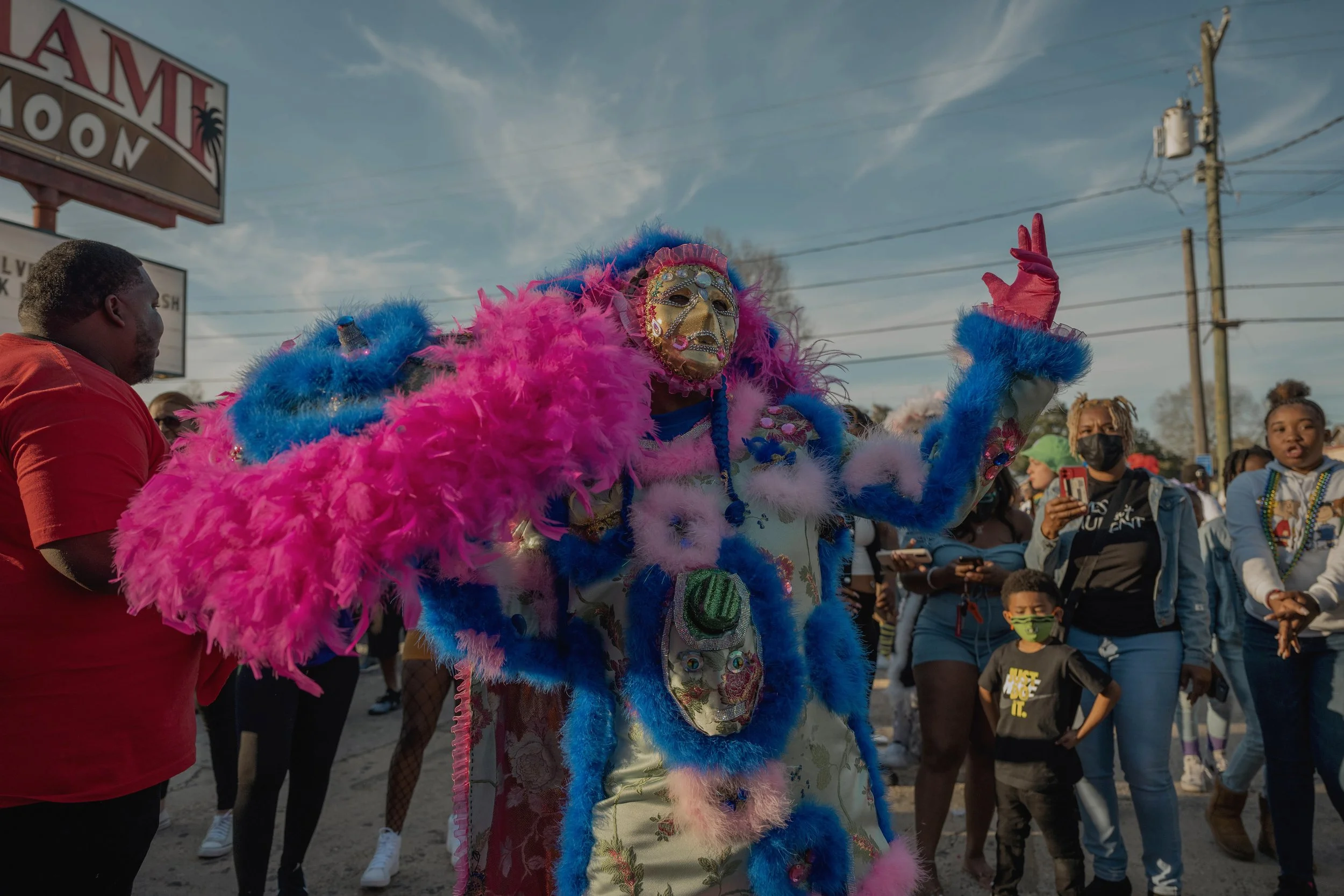 Old timers, such as Alton “lil tiger” Armstrong, Patrick Frances, Mr. Bucket, Mr. John, Mama Cat, and Miss Dolly Mae (The Queen) and countless others came together over the past couple of decades to sew costumes, wear costumes, bear wisdom, or support the process. OG Big Chief said when he was coming up, kids weren’t allowed out of the front yard on Carnival Day, so these community members made it a mission to make parades accessible to their neighborhoods, especially children.
